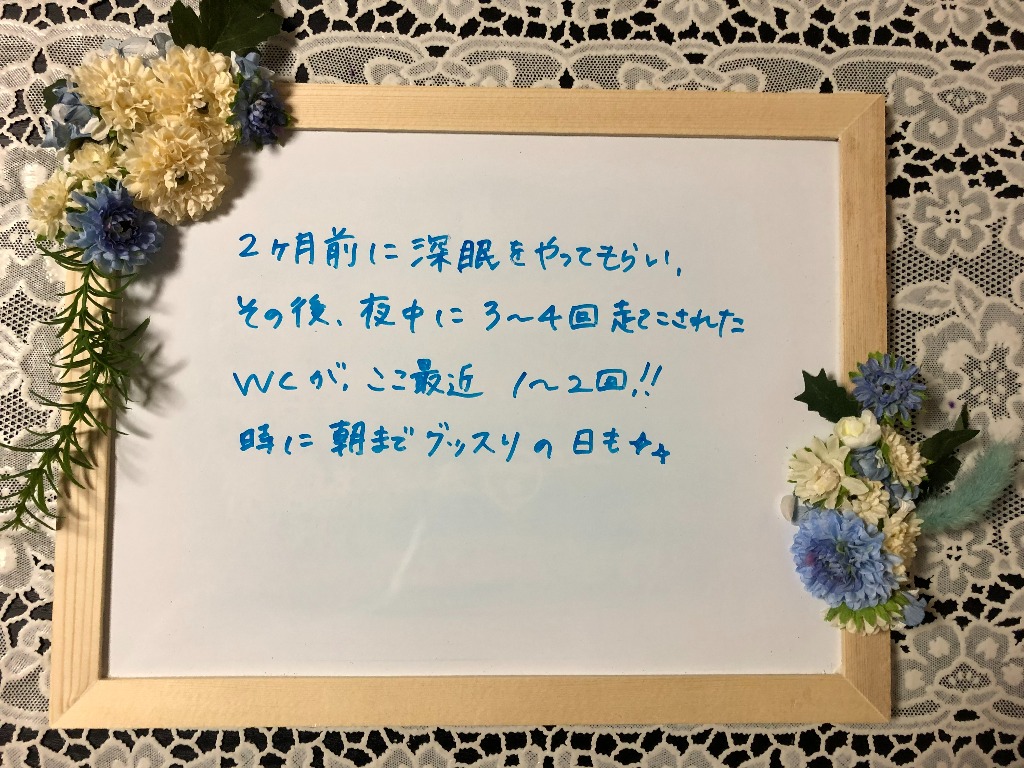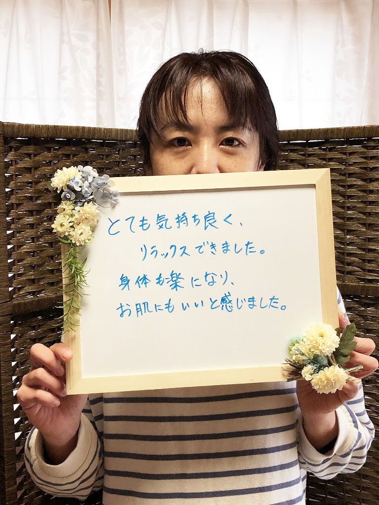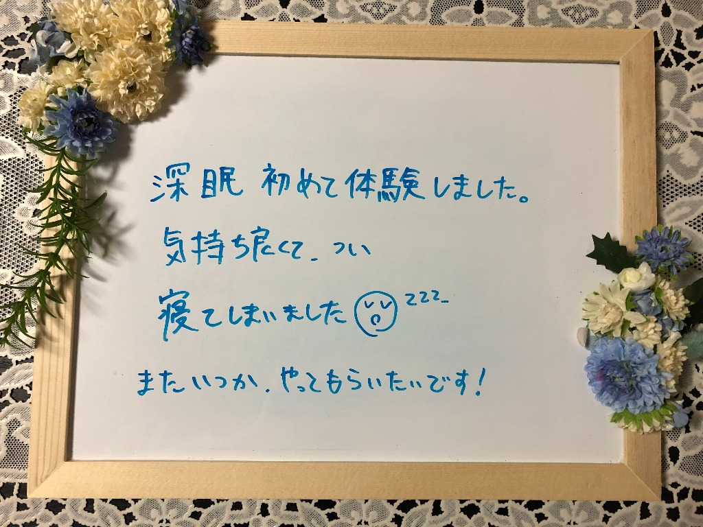 最近仕事が忙しくて疲れがピークだったので、このタイミングで深眠タッチセラピーを受けることができてよかったです。頭も体もとてもすっきりして今夜はぐっすりと眠れそうです。ありがとうございました。