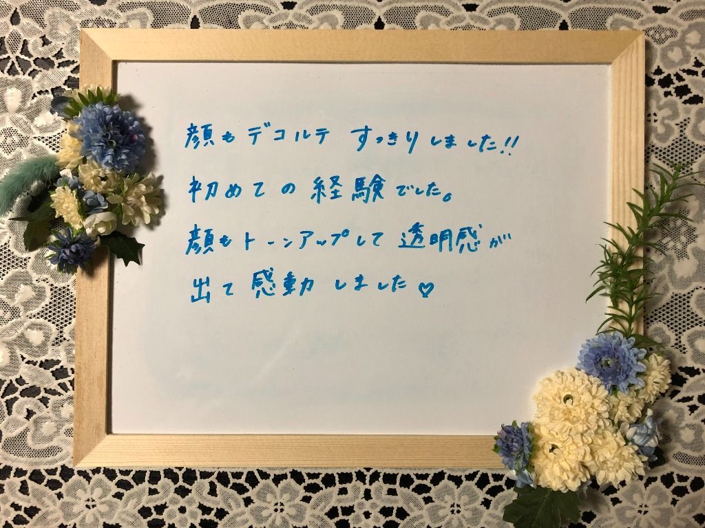 深眠タッチとフェイシャルとても気持ちよくていつも寝てしまうほどです。今日こそは頑張って起きていようと思っていましたが・・・いつの間にか記憶が飛んでいました(笑)また来月もよろしくお願いします!